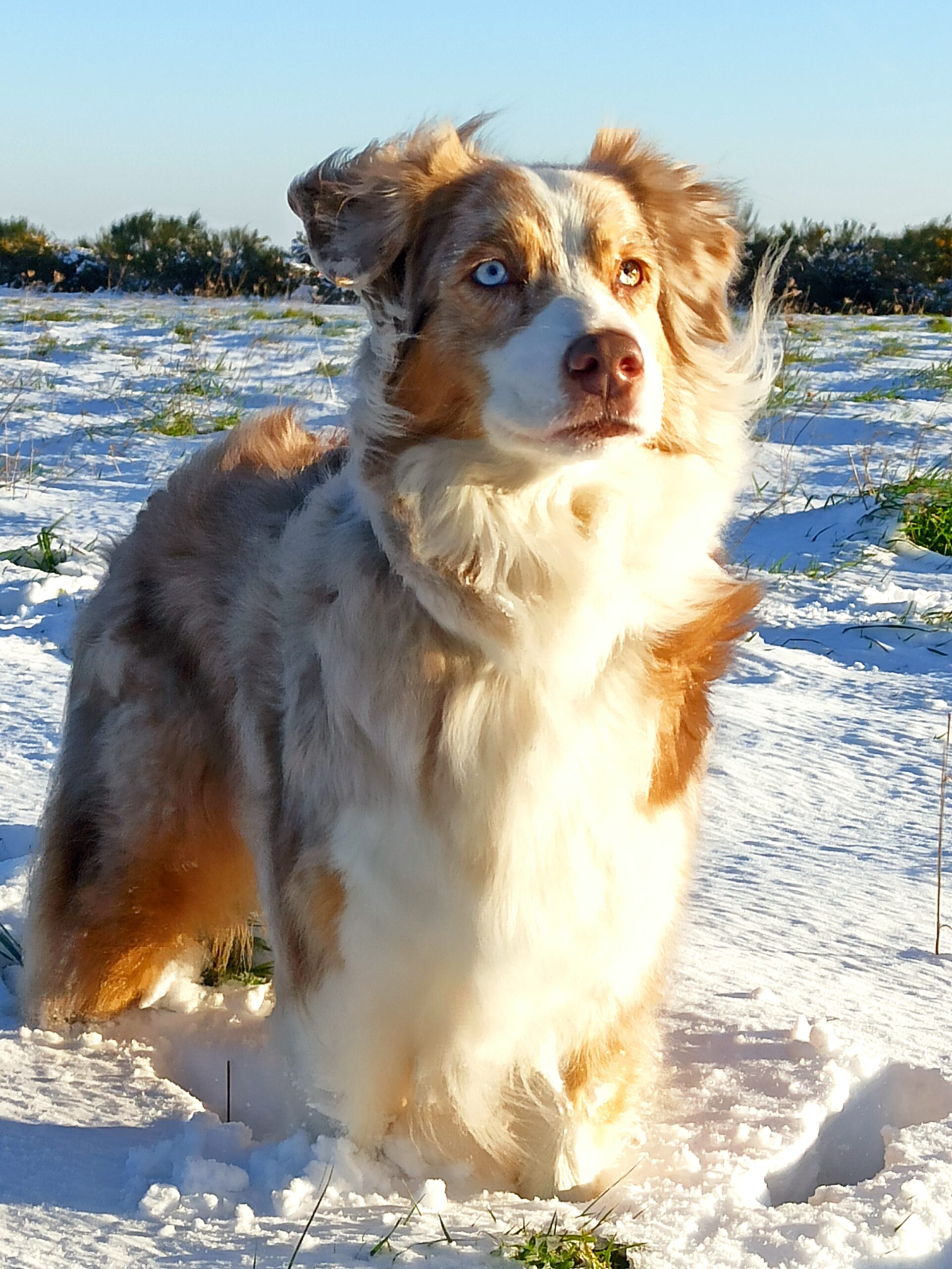 berger australien dans la neige dans les Côtes d’Armor photo Educ’aussie